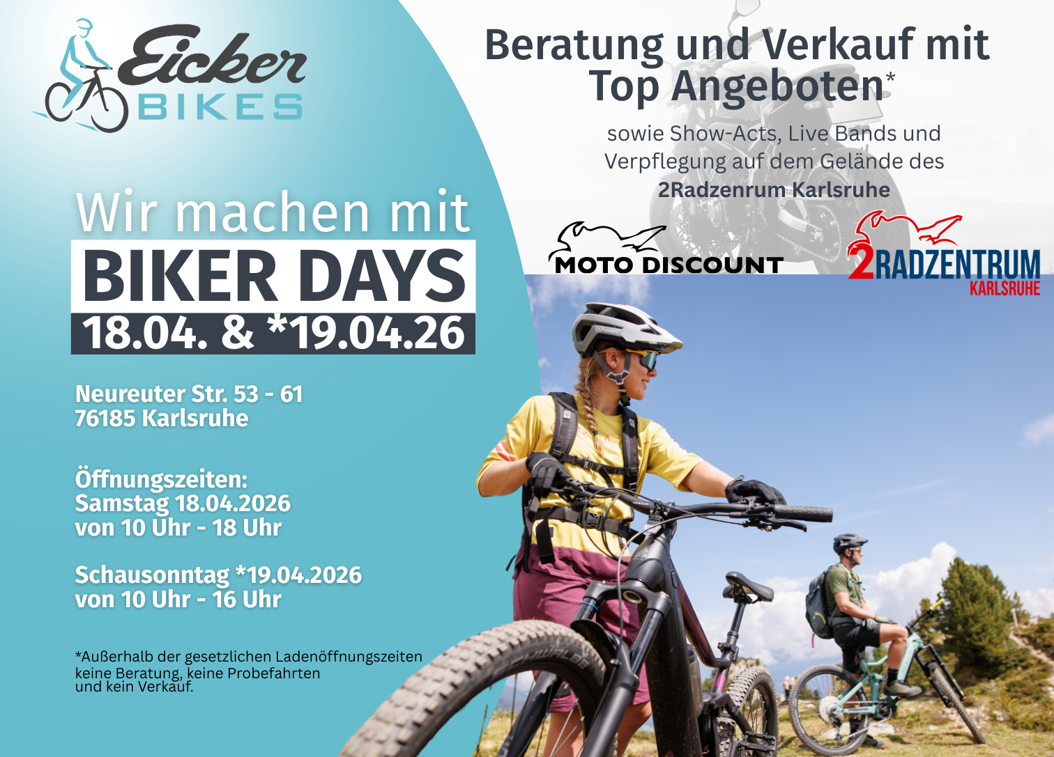 Am 18. und 19. April 2026, jeweils ab 10:00 Uhr, finden im Innenhof des 2RADZENTRUM Karlsruhe (Neureuter Str. 53) gemeinsam mit Motodiscount die Biker Days 2026 statt.